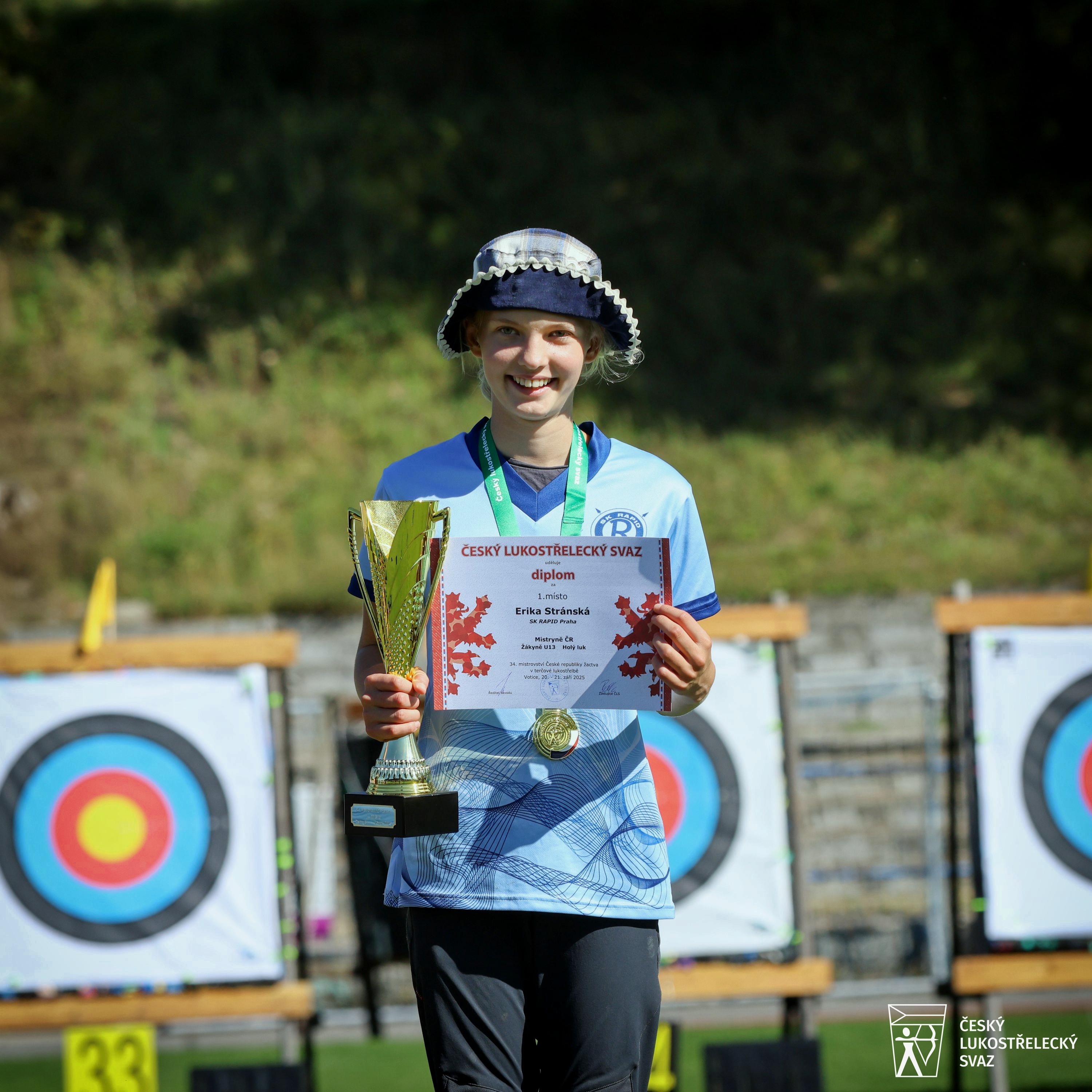 Další zlatá medaile pro Eriku Stránskou v kategorii U13W, divize holý luk, tentokrát z 34. Mistrovství ČR v terčové lukostřelbě žatstva. V kvalifikaci nastřílela krásných 650 bodů. Blahopřejeme!!!